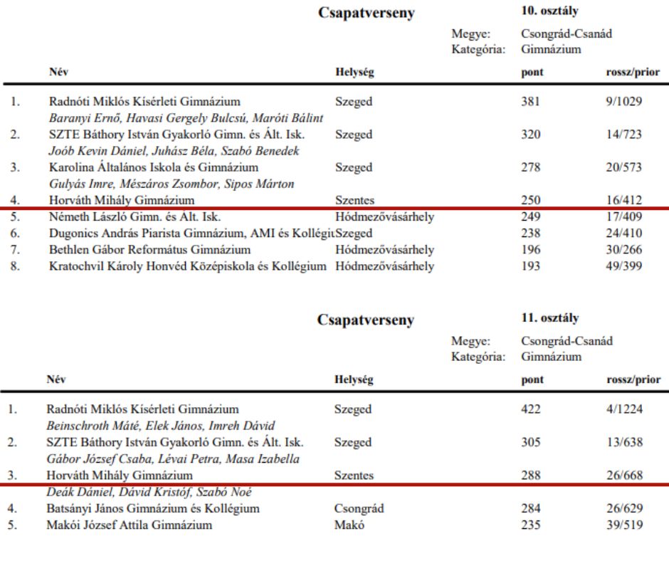 Tanulóink a Hódmezővásárhelyi Tankerületi Központ középiskolái közül a legjobb eredményt szerezték meg, ezzel bizonyítva kitartásukat, tehetségüket és a matematika iránti elkötelezettségüket.